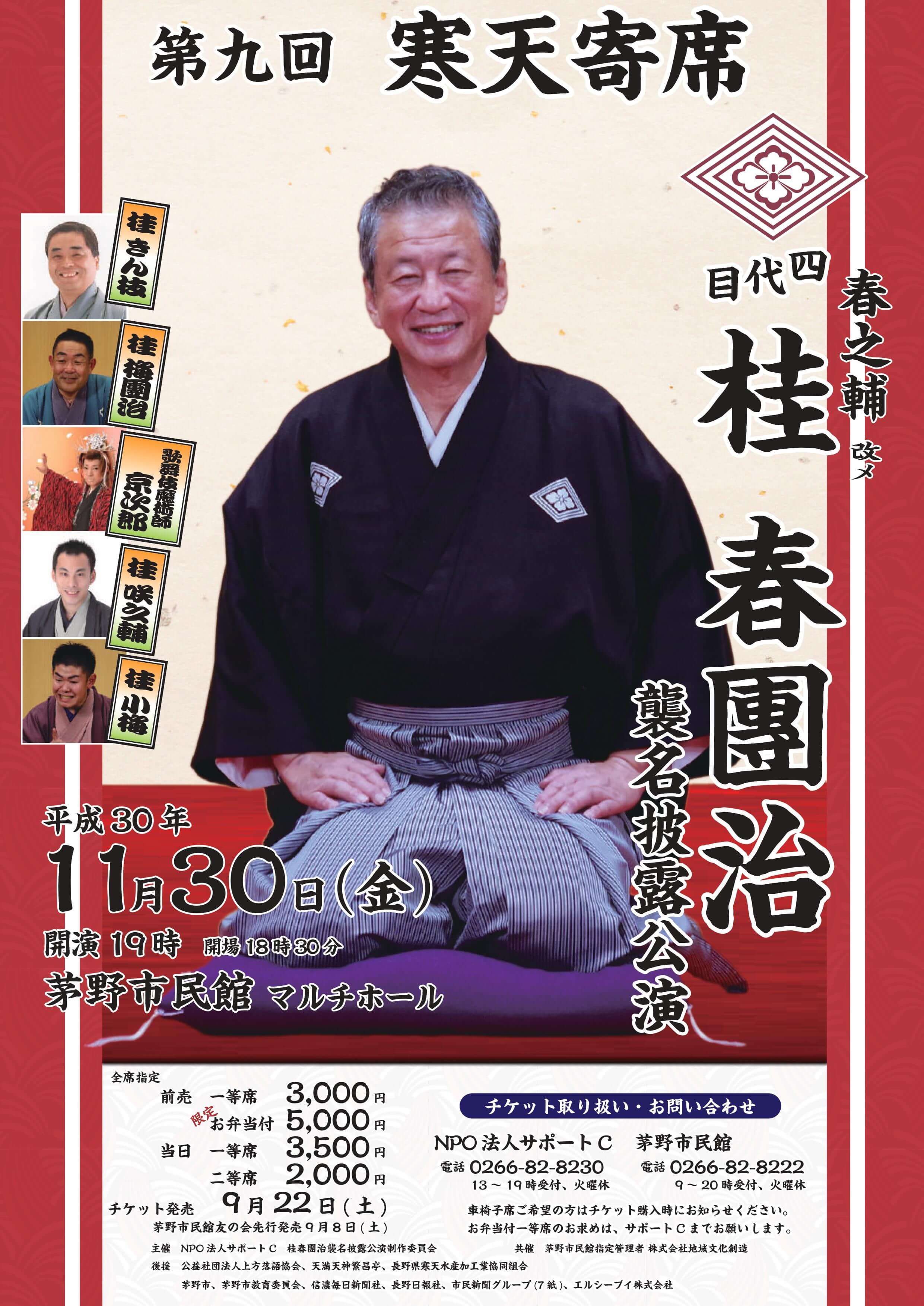 茅野市民館主催事業として地域の皆様に親しまれてまいりました「寒天寄席」を、今年十一月、NPO法人サポートCが主催することと相成りました。三年半ぶりの開催となる寒天寄席には、四代目桂春團治の襲名披露公演を執り行わせていただきます。